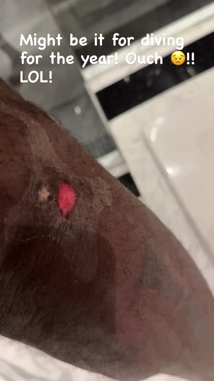 詹姆斯晒出他右腿上一处已经皮肤破损的伤口写道:“也许是因为那次那次年度最佳扑球!好痛啊😣!!哈哈!”